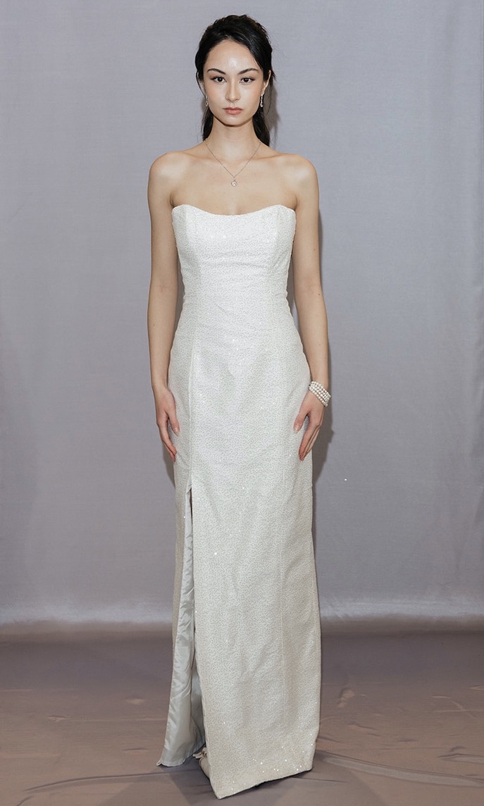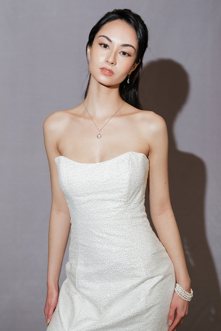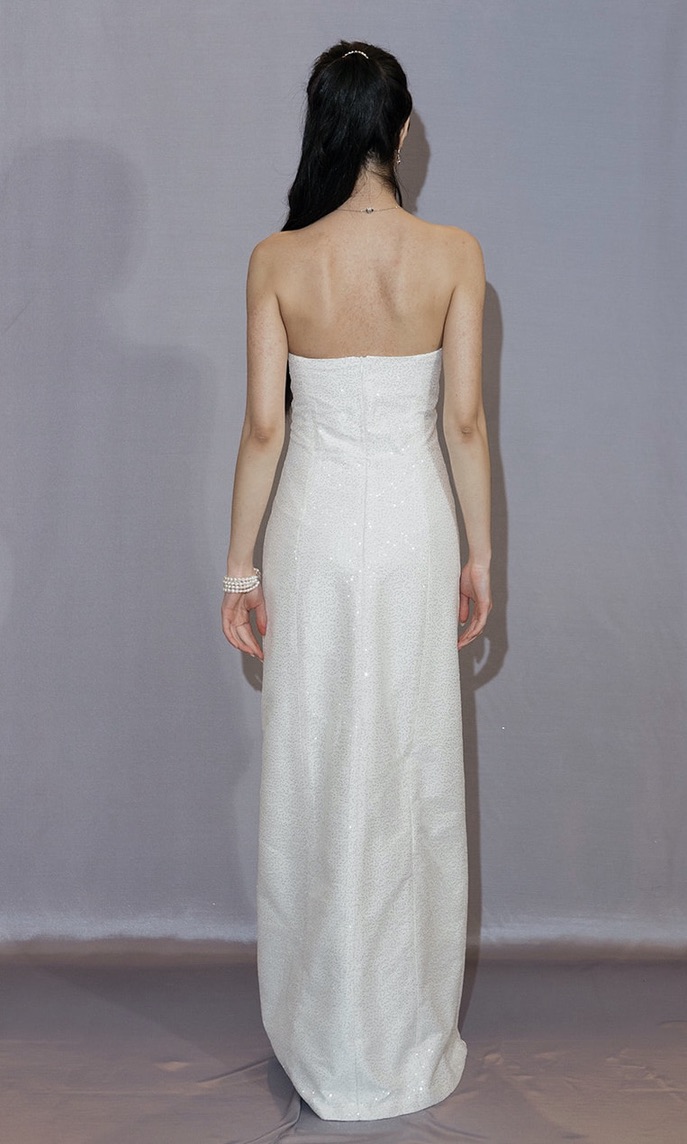 The Greta is a full sequin column dress with a soft scoop neckline. It comes with an removable over skirt that features the same sequin tulle as the dress, a thin horsehair trim to add volume around the edges and ties with a ribbon in the front.
