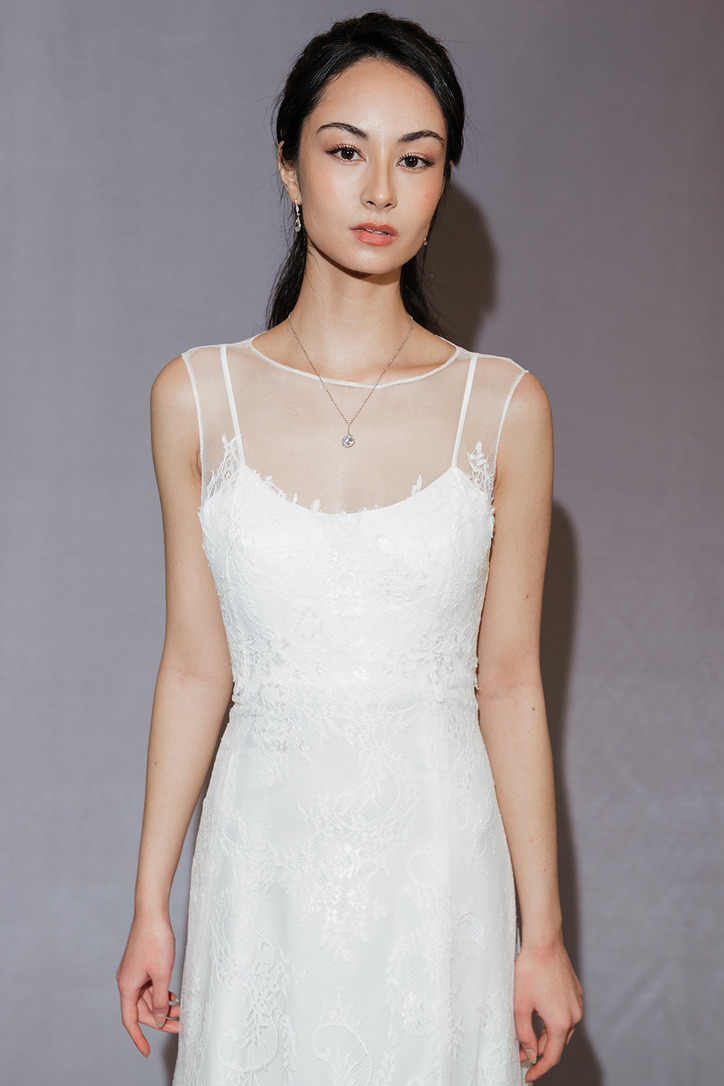Lynn is a slip gown made of silk charmeuse with a scoop neck line, a low back and a flowy A-line skirt. It is fully lined, and can be worn on its own. Want a little more frill? We offer a beautiful sleeveless overlay made of chantilly lace with functional buttons down the back.