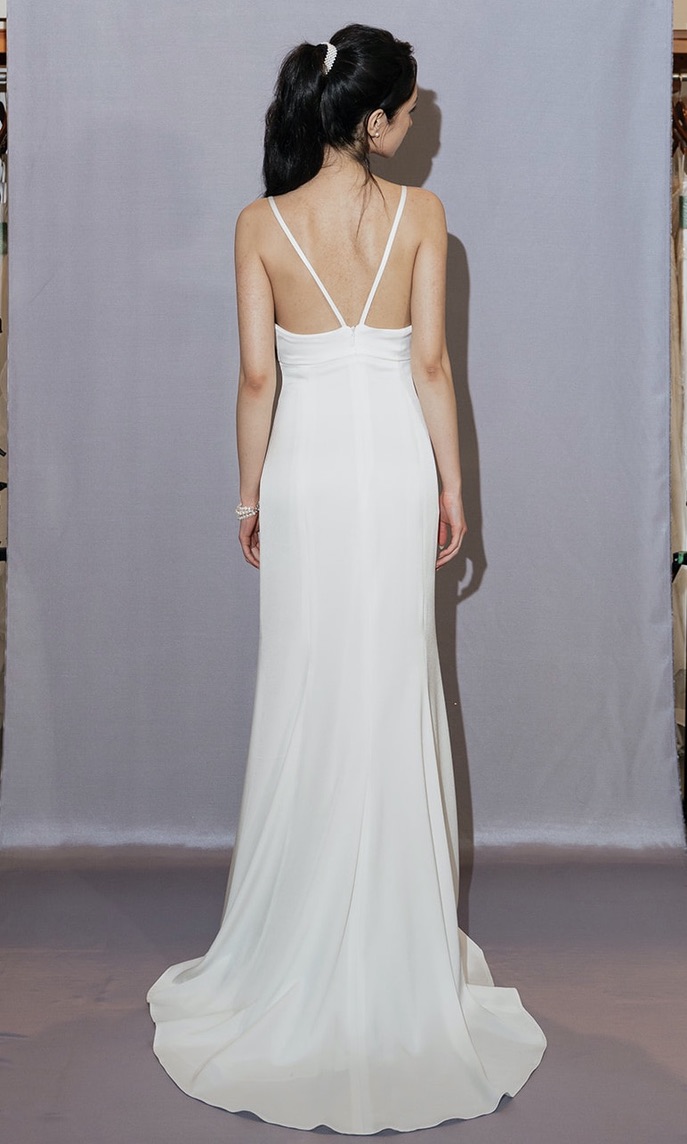 Sylvie is a slip style wedding dress with a deep v neckline, a low back and thin straps. It also features a removable beaded lace capelet.